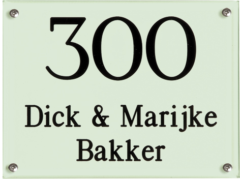 Glaslook is geen glas (glas is uiteraard erg breekbaar), maar een luxe en tegelijk stevige kunststofsoort (8 mm dikte) met de uitstraling van glas. Het materiaal is dan ook volledig doorzichtig en verkrijgbaar in verschillende kleurvarianten. Glaslook is uitstekend geschikt voor gebruik in en rondom uw woning. De tekst wordt in alle glaslook-naamborden gegraveerd, waardoor uw naam niet weg kan slijten of vervagen. Het bijzondere aan glaslook is dat het aan de achterzijde ingegraveerd wordt, dit in tegenstelling tot andere kunststofsoorten. Hierdoor blijft het materiaal aan de voorzijde glad en krijgt het een zeer luxe uitstraling. Tot slot: Glaslook wordt geleverd met afstandbusjes waardoor u het naambord eenvoudig op een korte afstand van de muur kunt monteren. Glaslook een zeer exclusieve kunststofsoort dat tegen een stootje kan!