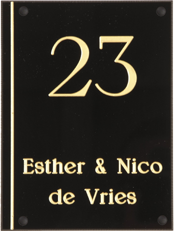 Gravoglas is een luxe en tegelijk stevige kunststofsoort (3 mm dikte), met de uitstraling van gekleurd glas, welke uitstekend geschikt is voor gebruik in en rondom uw woning. De tekst wordt in alle gravoglas-naamborden gegraveerd, waardoor uw naam niet weg kan slijten of vervagen. Het bijzondere aan gravoglas is dat het aan de achterzijde ingegraveerd wordt, dit in tegenstelling tot andere kunststofsoorten. Hierdoor blijft het materiaal aan de voorzijde glad en krijgt het een hele luxe uitstraling. Tot slot: de gravoglas-naamborden zijn standaard voorzien van schroefgaten (tenzij anders vermeld) en worden geleverd met afstandbusjes en afdekdopjes waardoor u het naambord eenvoudig op een korte afstand van de muur kunt monteren.