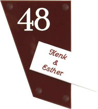 Perspex is een stevige kunststofsoort (3 mm dikte), welke uitstekend geschikt is voor gebruik in en rondom uw woning. De tekst wordt in alle perspex-naamborden gegraveerd, waardoor uw naam niet weg kan slijten of vervagen. De transparante perspex naamborden worden aan de achterzijde ingegraveerd (waardoor de voorkant glad blijft) en de gekleurde perspex naamborden worden aan de voorzijde ingegraveerd. Tot slot: de perspex-naamborden zijn standaard voorzien van schroefgaten (tenzij anders vermeld) en worden geleverd met afstandbusjes en afdekdopjes waardoor u het naambord eenvoudig op een korte afstand van de muur kunt monteren. Perspex een luxe kunststofsoort dat tegen een stootje kan!