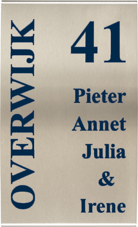 RVS is een zeer sterke staalsoort, welke uitstekend geschikt is voor gebruik in en rondom uw woning. RVS staat voor roest-vast-staal en is daardoor bijzonder weersbestendig, maar niet geheel vrij van onderhoud. Daarom dient uw RVS-naambord af en toe met HG snelglans (te verkrijgen bij de doe-het-zelf vakman en/of bouwmarkt) behandeld te worden. Het is niet verstandig de RVS-naamborden te poetsen, doordat de tekst op alle RVS-naamborden beletterd wordt; zo kan de tekstlaag niet beschadigen of vervagen, indien u geen belettering wenst, dient dit aan te geven in de opmerkingen, wij voorzien dan het naambord van een lasergravure, deze is altijd antraciet/zwart. Tot slot: alle RVS-naamborden worden standaard geleverd met RVS-bevestigingsmateriaal om zo oxidatie bij de schroefgaten tegen te gaan. (N.B. Bovenstaande geldt ook voor alle aluminium en RVS-look naamborden 1400/1500 serie met de uitzondering dat deze naamborden standaard zonder schroefgaten, maar zelfklevend geleverd worden). RVS uniek materiaal, geschikt voor allerlei stijlen, dat tegen een stootje kan!