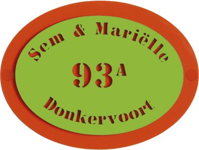 Sjabloonstyle is een unieke serie van het materiaal perspex. Perspex is een stevige kunststofsoort (3 mm dikte), welke uitstekend geschikt is voor gebruik in en rondom uw woning. In de serie sjabloonstyle worden twee kleuren perspex op korte afstand van elkaar gemonteerd. De tekst wordt in de serie sjabloonstyle door de bovenste plaat (de tekstplaat) heen gegraveerd, waardoor de onderliggende plaatkleur (de achterplaat) verschijnt. Uw naam kan hierdoor niet weg slijten of vervagen. Tot slot: de naamborden uit de serie sjabloonstyle zijn standaard voorzien van schroefgaten (tenzij anders vermeld) en worden geleverd met afstandbusjes en afdekdopjes waardoor u het naambord eenvoudig op een korte afstand van de muur kunt monteren. Sjabloonstyle: een unieke, luxe kunststofsoort die tegen een stootje kan!